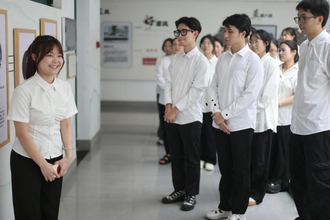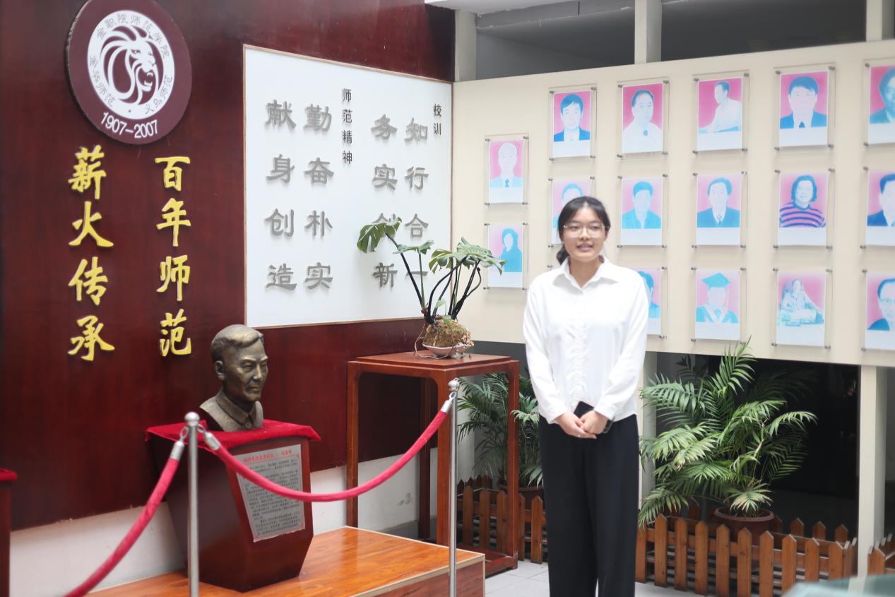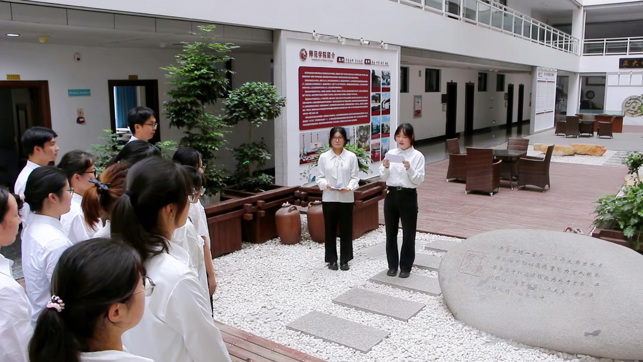 为了让学子直观感受师范精神的传承,学生党员来到学院一楼大厅,天井处的“半亩方塘”雅致清幽,兼具学生活动与成果展示功能,还呼应文化意境,传递“尚德重能”育人根本。历经风雨、被师生守护的“团龙”石雕,更让“正大诚明”育人理念深入人心,学前教育专业学生党员郭少楠感慨,”学院建筑皆有故事,让自己对‘师范人’身份更有归属感“。