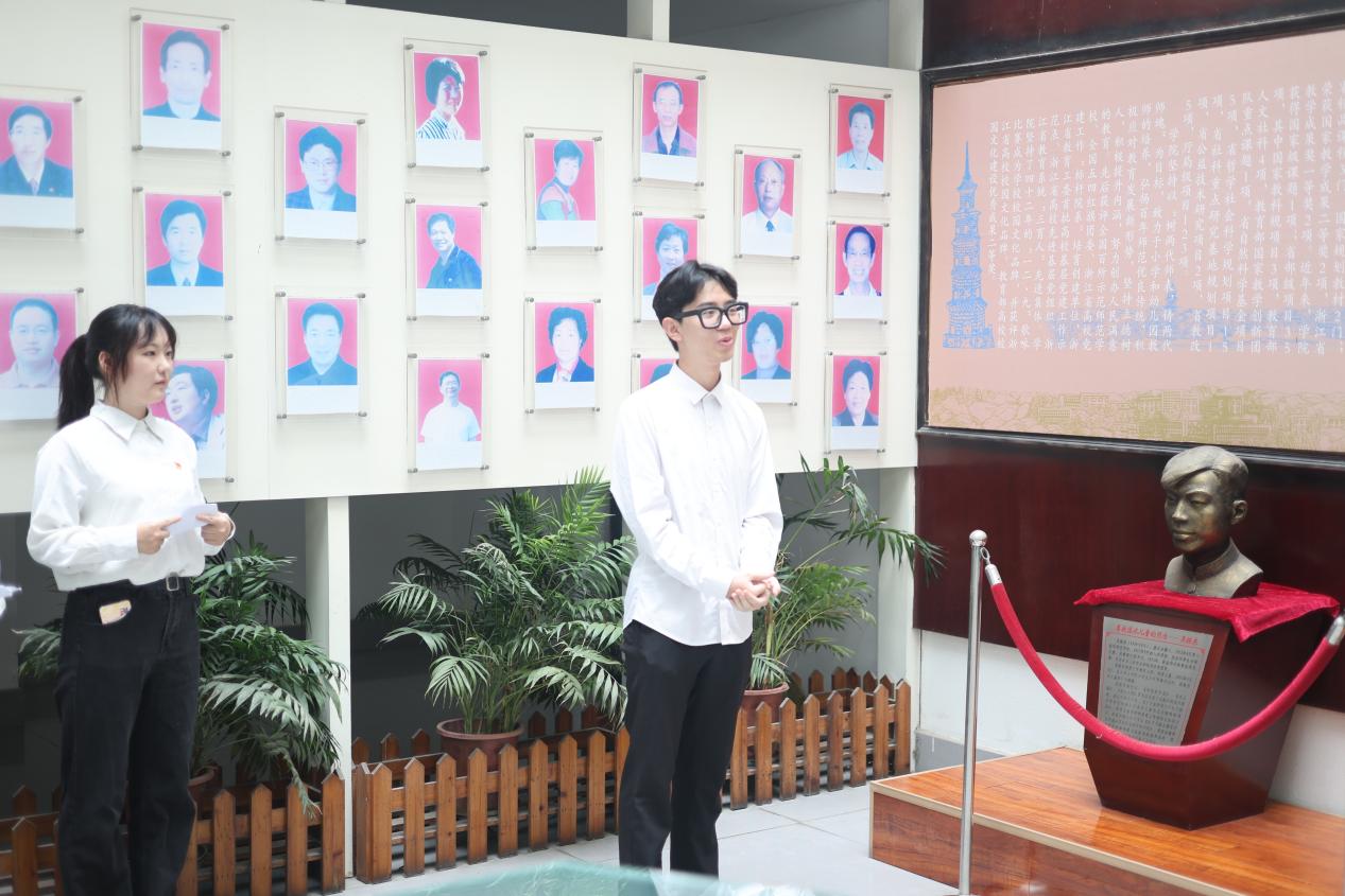 师范学院内的”革命先辈纪念馆“是红色精神的“传承课堂”,于2008年学院百年校庆时始建,2018年修缮升级。学生党员认真聆听钱兆鹏、吴振东、冯雪峰三位先辈事迹。“先辈们的雕像不是陈列的展品,而是我们要刻进心里的‘教案’。”纪念馆内,学生党员们分组讨论着先辈事迹带来的触动。来自小学教育专业的学生党员黄俊源分享道:“吴振东烈士对小学教育工作的热爱和对儿童的关怀,让我深刻理解了‘献身’二字的分量,未来我将以他为榜样,用心呵护每一个孩子。”随后,全体学生党员齐声诵读“勤奋 朴实 献身 创造”的师范精神,铿锵有力的誓言回荡在纪念馆内。