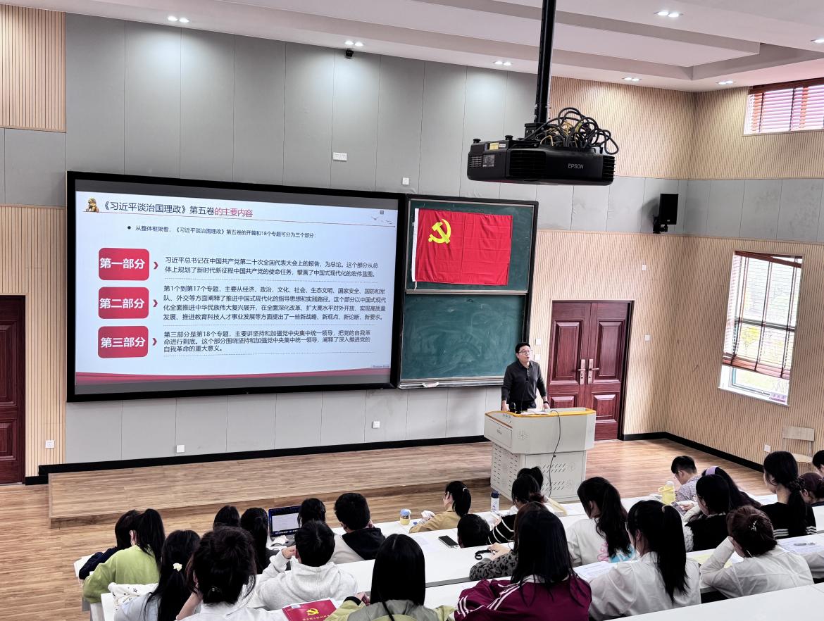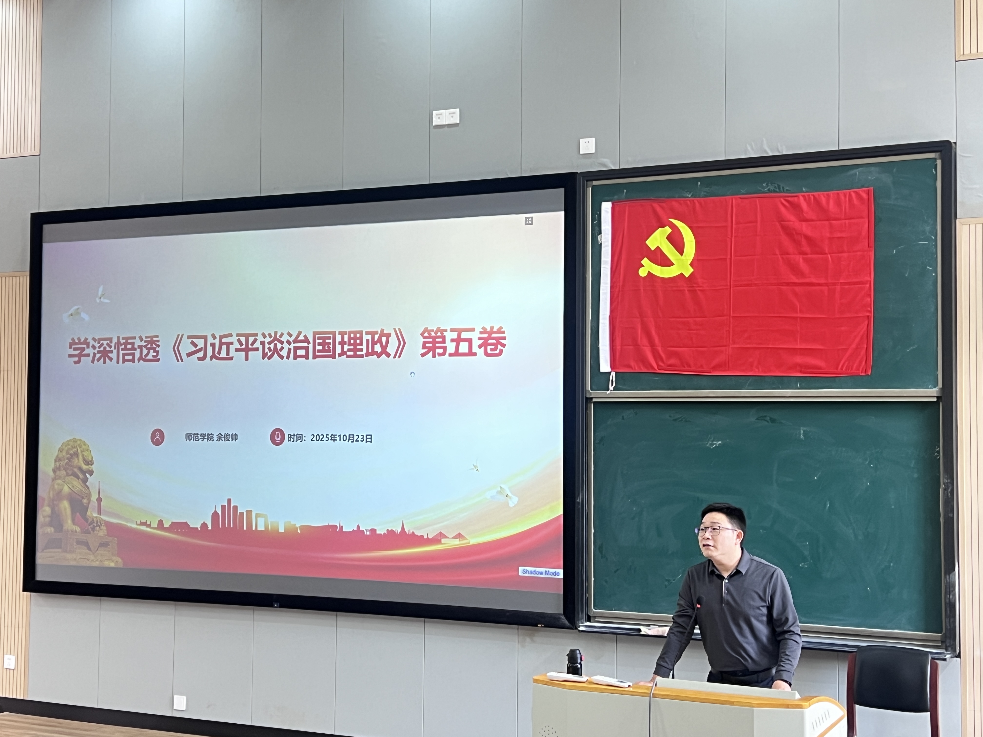 10月23日下午,师范学院学前教育第二党支部与附属幼儿园党支部全体党员师生齐聚西教四418教室,共同参加第四季度党课学习。本次党课由师范学院副院长余俊帅同志主讲,主题聚焦“学深悟透《习近平谈治国理政》第五卷”,旨在推动党的创新理论入脑入心、走深走实。