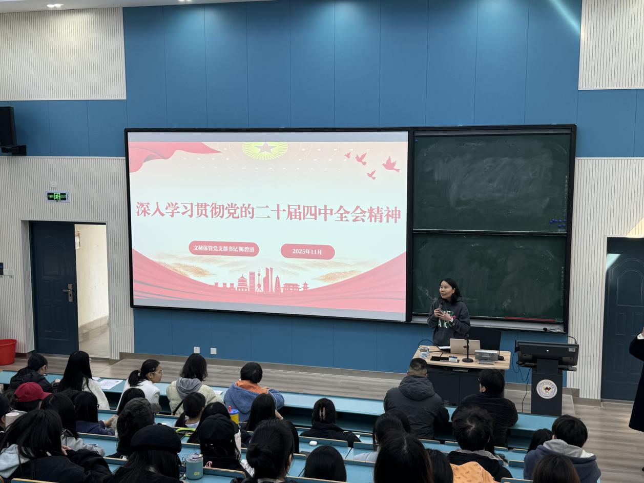 为深入学习贯彻党的二十届四中全会精神,准确把握“十五五”时期的目标任务与战略部署,切实统一思想认识、明确前进方向,师范学院文秘体管党支部于11月20日在西四218组织召开了专题宣讲会。本次宣讲由党支部书记陈碧清主讲,全体师生党员、入党积极分子参加。