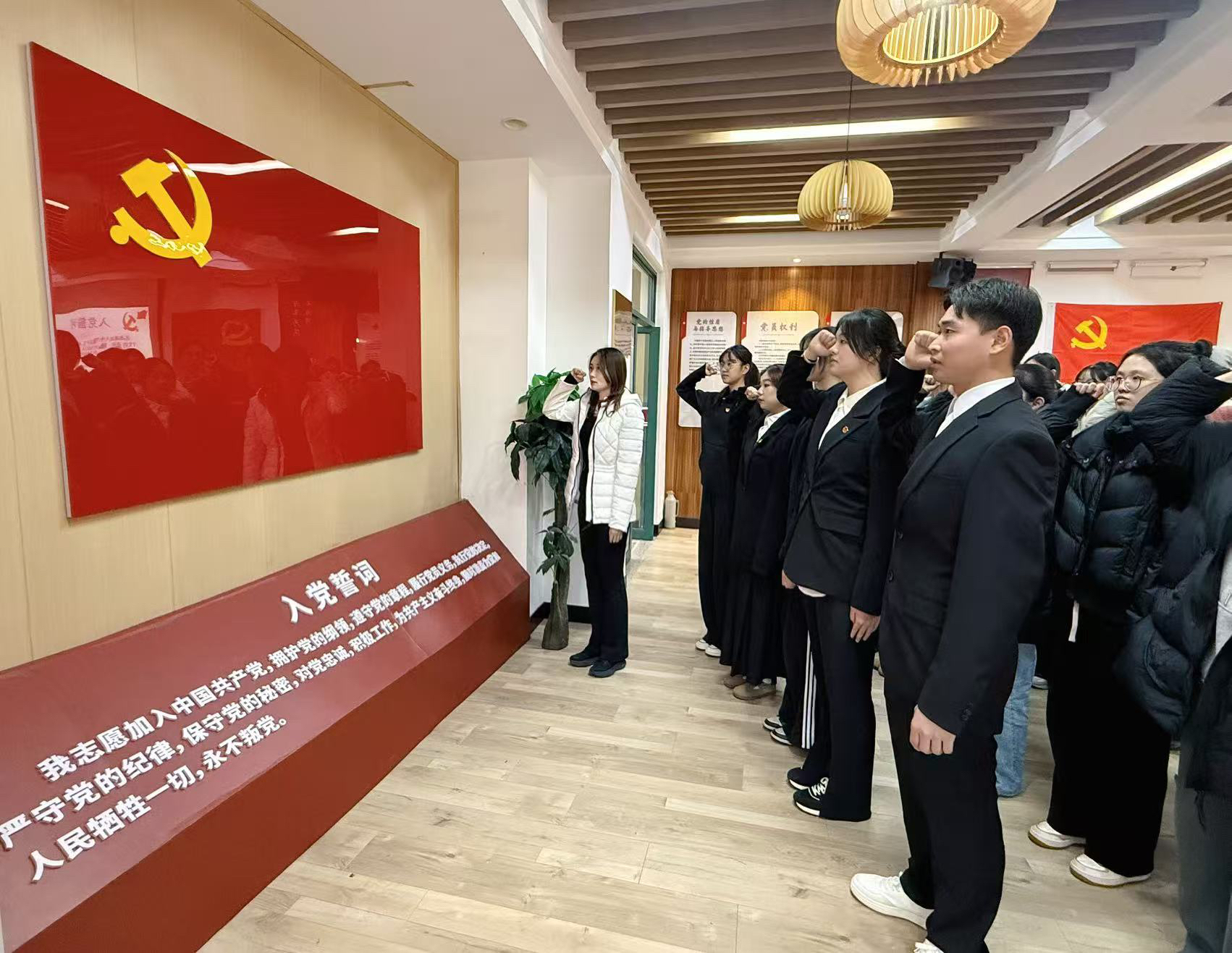 “我志愿加入中国共产党……”全体党员面向党旗,高举右拳,重温入党誓词,铿锵恢宏的誓言字字千钧,提醒着每一位党员铭记誓言、恪守承诺、担当使命。