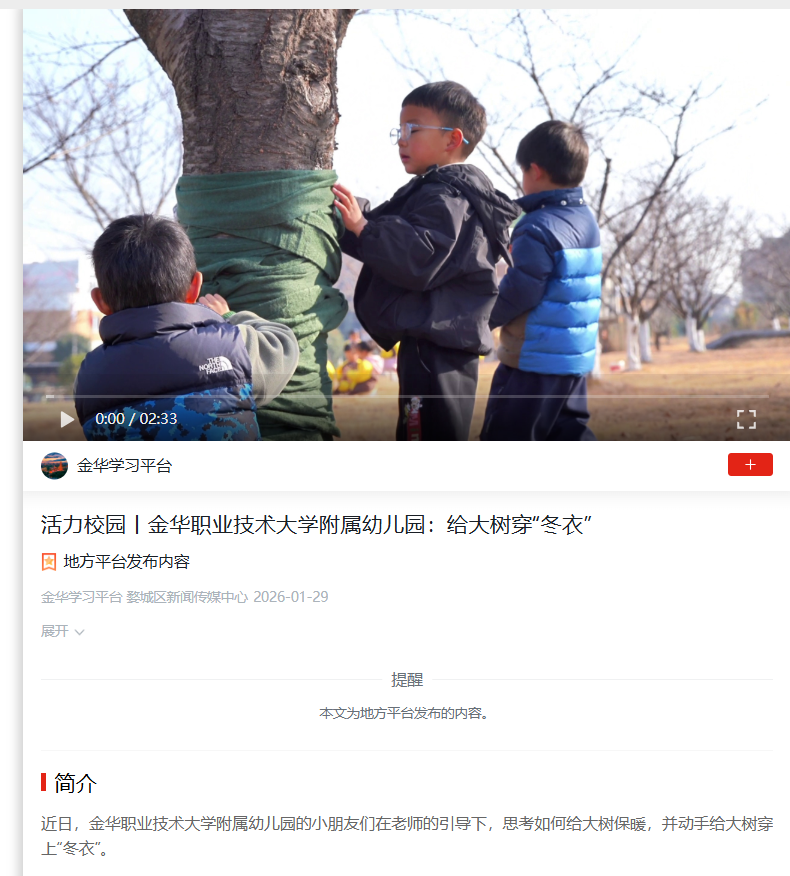 学习强国:活力校园丨金华职业技术大学附属幼儿园:给大树穿“冬衣”