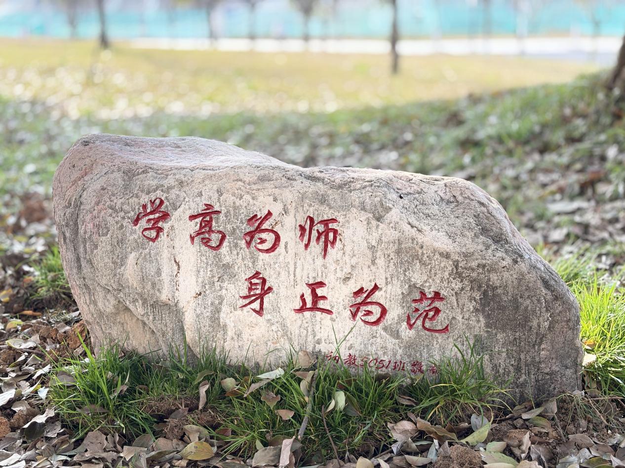 “让这份情谊也有个归宿!”活动尾声,同学们共同为母校送上一份特别的礼物——一块承载着深深感恩与永恒纪念的青石。石身沉稳,静静地矗立在师范学院教学楼前的草坪上。正面镌刻着“学高为师 身正为范,初教5051班敬献”的铿锵字句,诉说着对师范精神的坚守与传承;背面则铭刻着“师恩长忆 寸心永铭”,寥寥数语,却凝聚了全班同学对母校和恩师二十年来未曾褪色的深情。这块“时光之石”,不仅是献给校园的实物纪念,更是一枚刻进岁月里的情感印章。这份沉甸甸的礼物,将成为校园里一道温暖的风景,默默陪伴一代代学子成长,见证师道传承,也铭记这场跨越山海、奔赴而来的青春重逢。