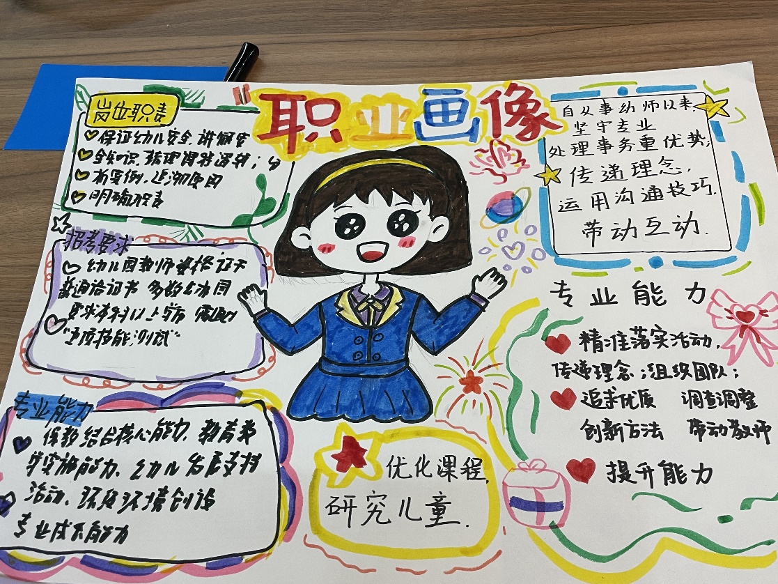 最后,全体学生党员以小组为单位,围绕活动主题开展研讨并共同绘制职业画像,学生党员孟嘉怡表示:“通过今天的职业画像绘制,我第一次系统地思考自己要成为什么样的幼师,也更加明确了自己努力的方向。”学生党员董亚敏分享道:“作为一名幼师,我们的成绩不是写在表格里的数据,而应该是孩子们健康成长的每一个瞬间。这份职业需要我们沉下心来,做长期主义的践行者。”学生党员们大家纷纷表示,通过此次主题党日活动,对幼师职业有了更深层次的理解与认同,进一步明确了未来努力的方向,将在今后的学习实践中不断锤炼本领、涵养情怀,努力成长为党和人民满意的“四有”好老师。