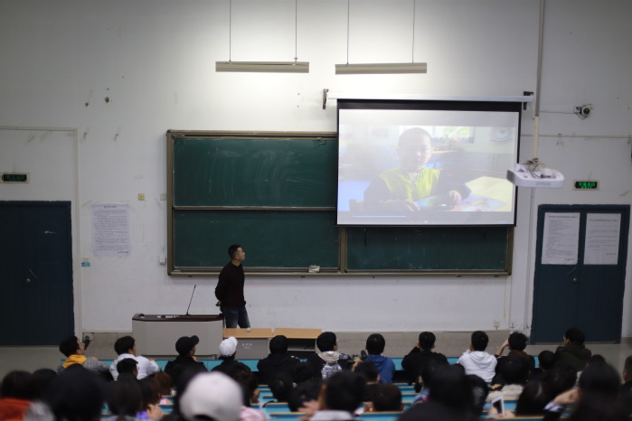 讲座伊始,汤润圣通过一段视频向我们展示了工作和生活中努力而有趣的他。接着,他从“为什么要做教师”展开,给在场听众解释了何为师,并从在学习中成长,在实践中成长,在反思中成长三个方面展示了自己的职业成长经历。他说:“从艺术老师到篮球老师、航模科学老师、网络信息老师、摄影老师、体育老师、留守儿童志愿老师……在一次次的转型当中,一次次挑战自我,过程虽然也遇到许多困难,但在看到小朋友的笑容时,觉得这一切辛苦是值得的。”