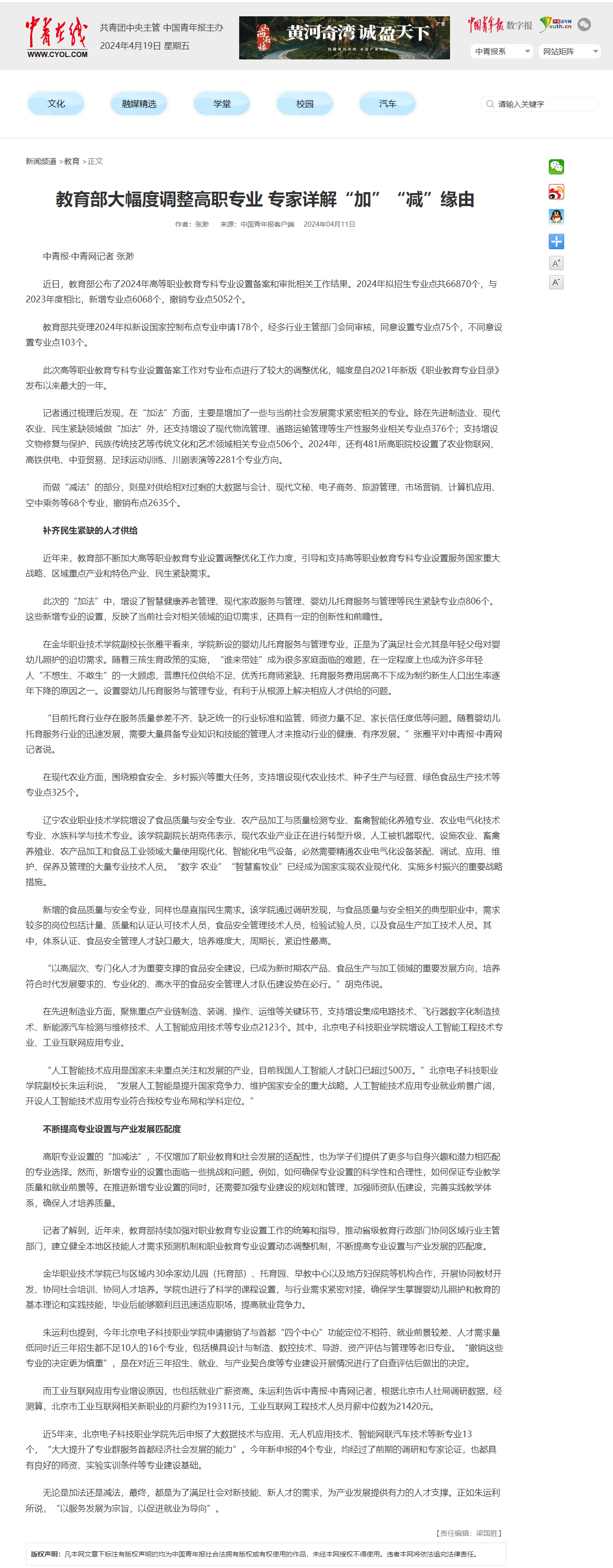 中青在线:教育部大幅度调整高职专业 专家详解“加”“减”缘由
