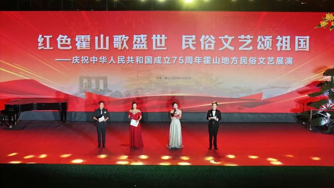 红色霍山歌盛世,民俗文艺颂祖国——庆祝中华人民共和国成立75周年霍山地方民俗文艺展演”在县城迎驾春风小镇举行。本次活动由中共霍山县委宣传部、组织部指导,县文联、安徽迎驾文旅集团、霍山县英才协会、西山文化研究会共同主办。举办本次活动旨在:庆祝新中国成立75周年,弘扬地方优秀传统文化,促进文旅融合及乡村振兴,丰富老百姓的音乐文化生活。霍山县委宣传部及县文联邀请我校杨松权老师担任本次大型文艺演出活动的总导演及节目演出,李波江老师担任执行导演,节琪琪、张润岳、席静参加演出活动。本次活动规模空前,有4000左右观众到现场观看本次演出活动,邀请了多名霍山籍艺术家及艺术团体参加表演,节目形式多样,突出“国庆”和“民俗展演”两大主题。音乐文化教学部几位教师出色的完成了本次大型演出活动,获得了极大的成功。杨松权老师作为本次活动的总导演,接受了安徽经视、六安卫视等新闻媒体的现场采访和报道。