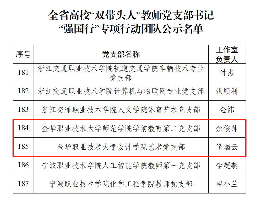 日前,中共浙江省委教育工作委员会办公室对全省高校“双带头人”教师党支部书记“强国行”专项行动团队名单进行公示,我院学前教育第二党支部成功入选。