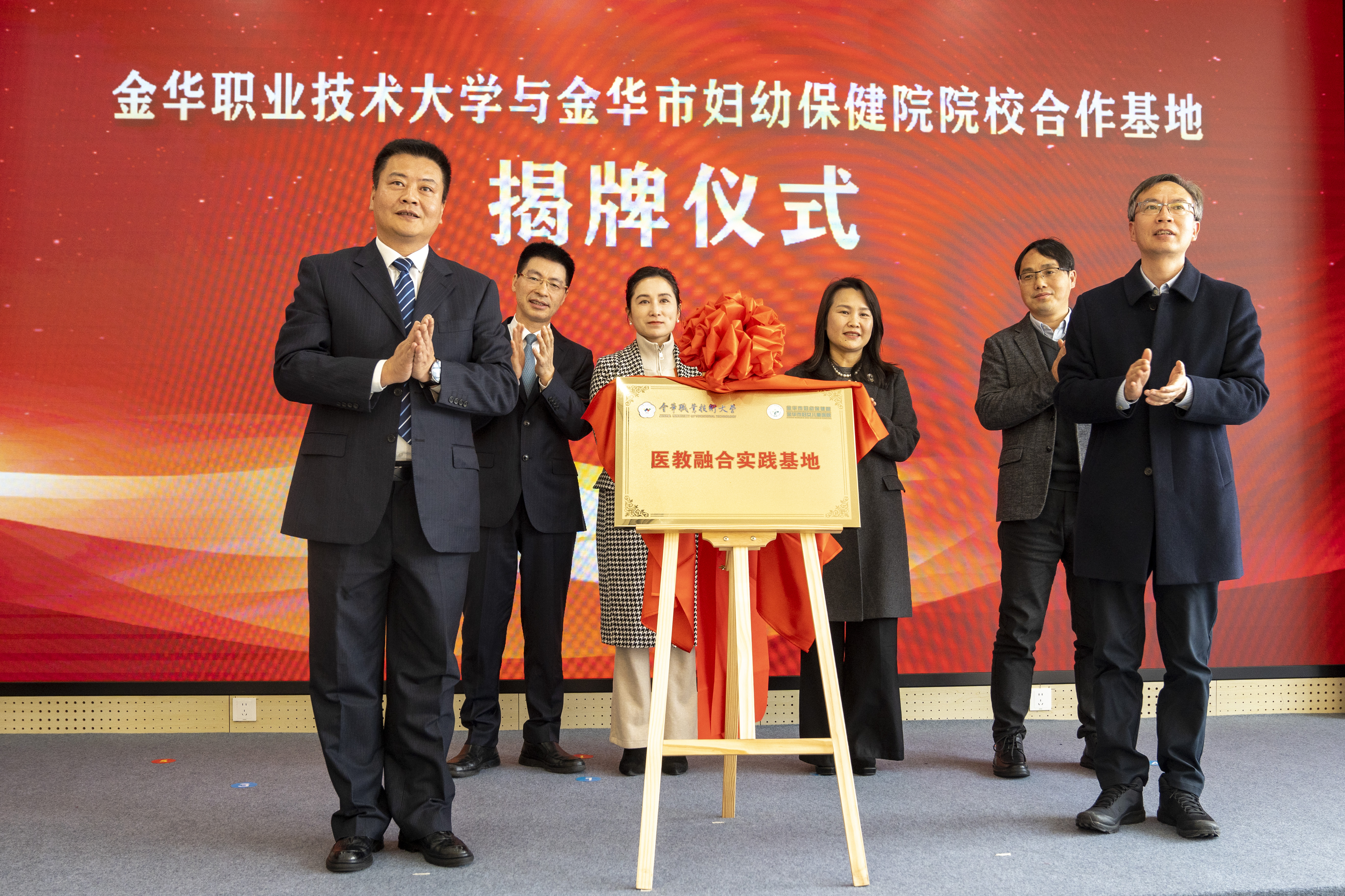 校发规处处长和市妇幼保健院院长共同为“金华职业技术大学医教融合实践基地”揭牌,标志着金华市医教协同发展迈入新阶段。
