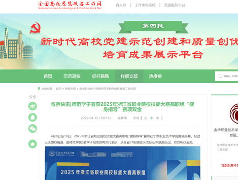 全国高校思想政治工作网:省赛快讯|师范学子喜获2025年浙江省职业院校技能大赛高职组“健身指导”赛项双金
