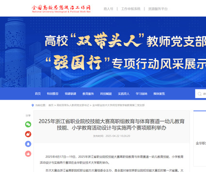 全国高校思想政治工作网:2025年浙江省职业院校技能大赛高职组教育与体育赛道一幼儿教育技能、小学教育活动设计与实施两个赛项顺利举办