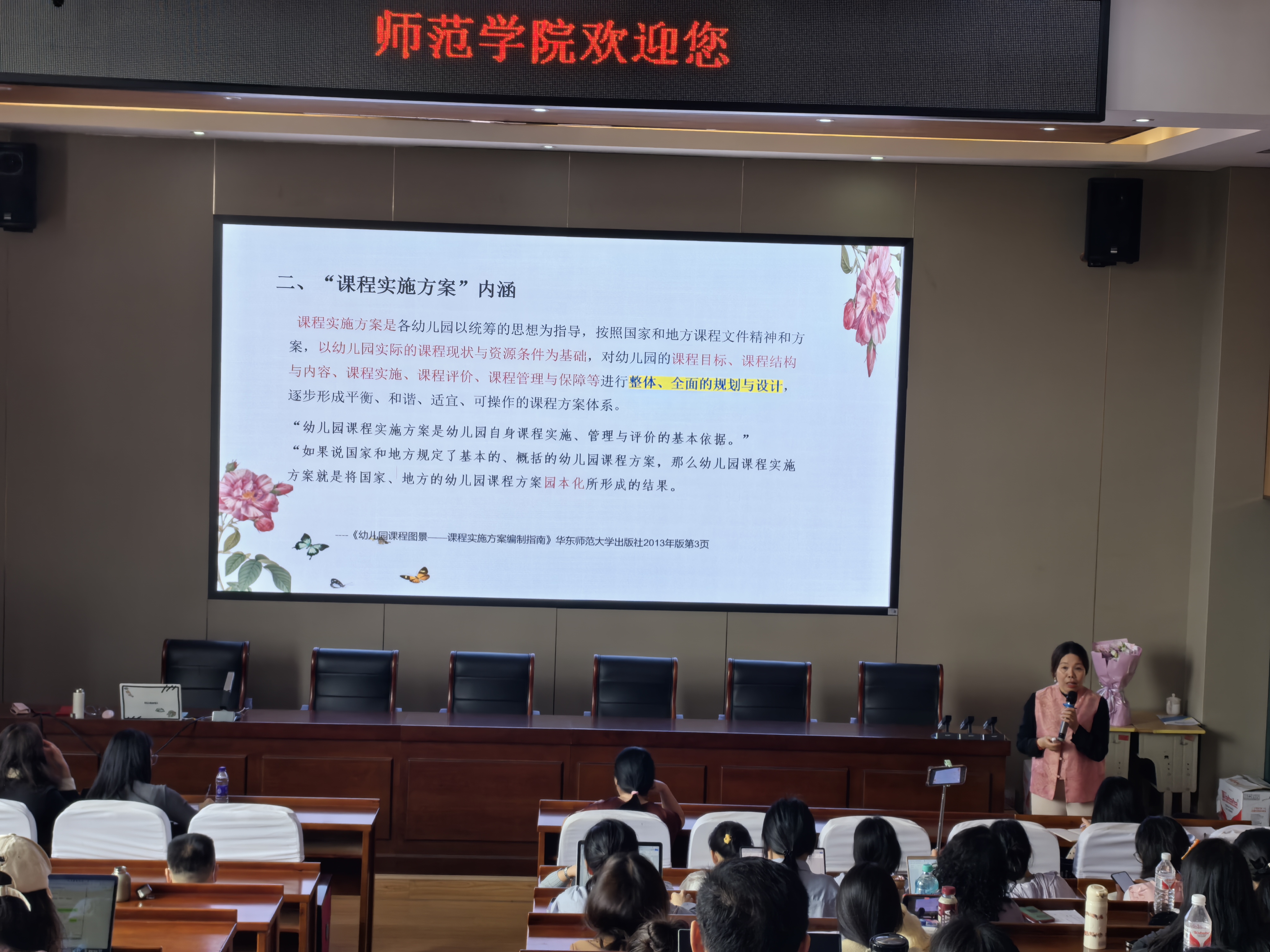 在专题培训中,浙江省学前教育研究会理事长、浙江师范大学儿童发展与教育学院朱宗顺教授和中国学前教育研究会幼儿园课程与教学专委会主任、浙江省基础教育课程改革专家组成员王春燕教授分别以《推进学前融合教育的法理逻辑、反思路径与行动研究》和《幼儿园课程方案的编制与实施》为题作主旨报告,为一线教师提供了可借鉴的宝贵经验,引发教师们频频点头。