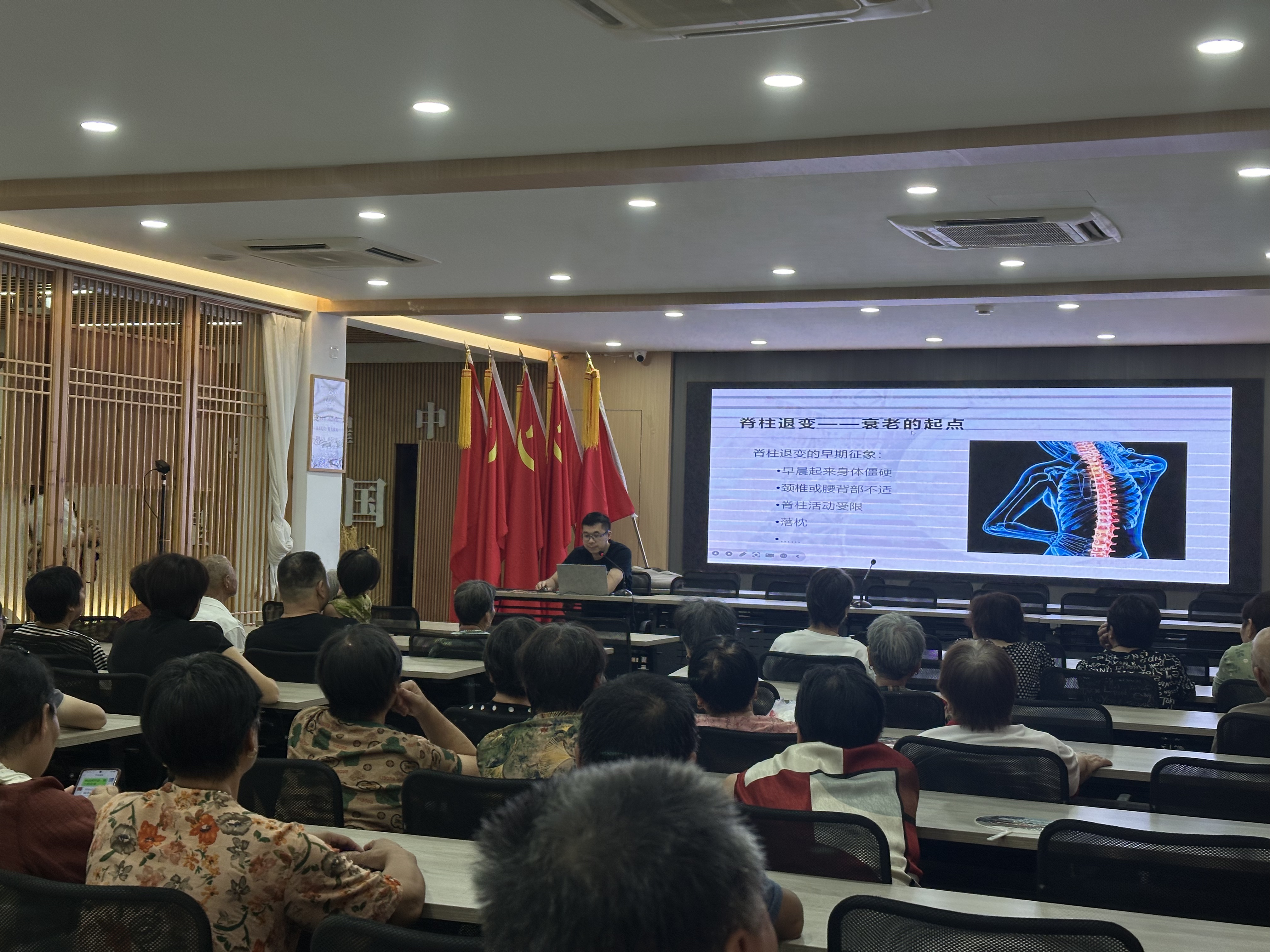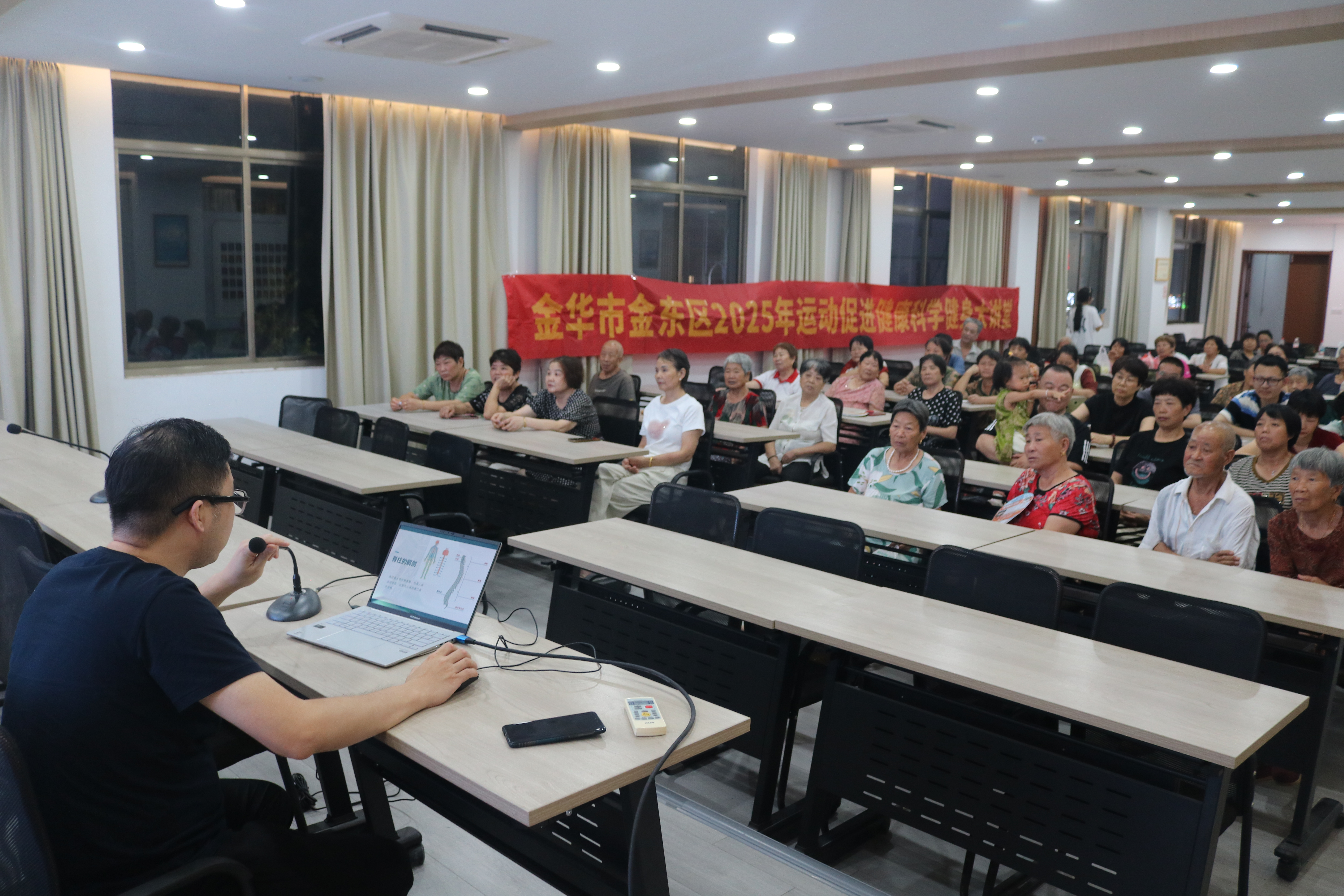 9月12日,由金华市金东区教育体育局主办、金华职业技术大学师范学院承办的第六期2025年运动促进健康科学健身大讲堂在塘雅镇新时代文明实践所成功举办。本次讲座以“脊柱健康与体态的关系”为主题,吸引了众多居民前来聆听,旨在提升大家对脊柱健康的重视,普及正确体态管理知识。