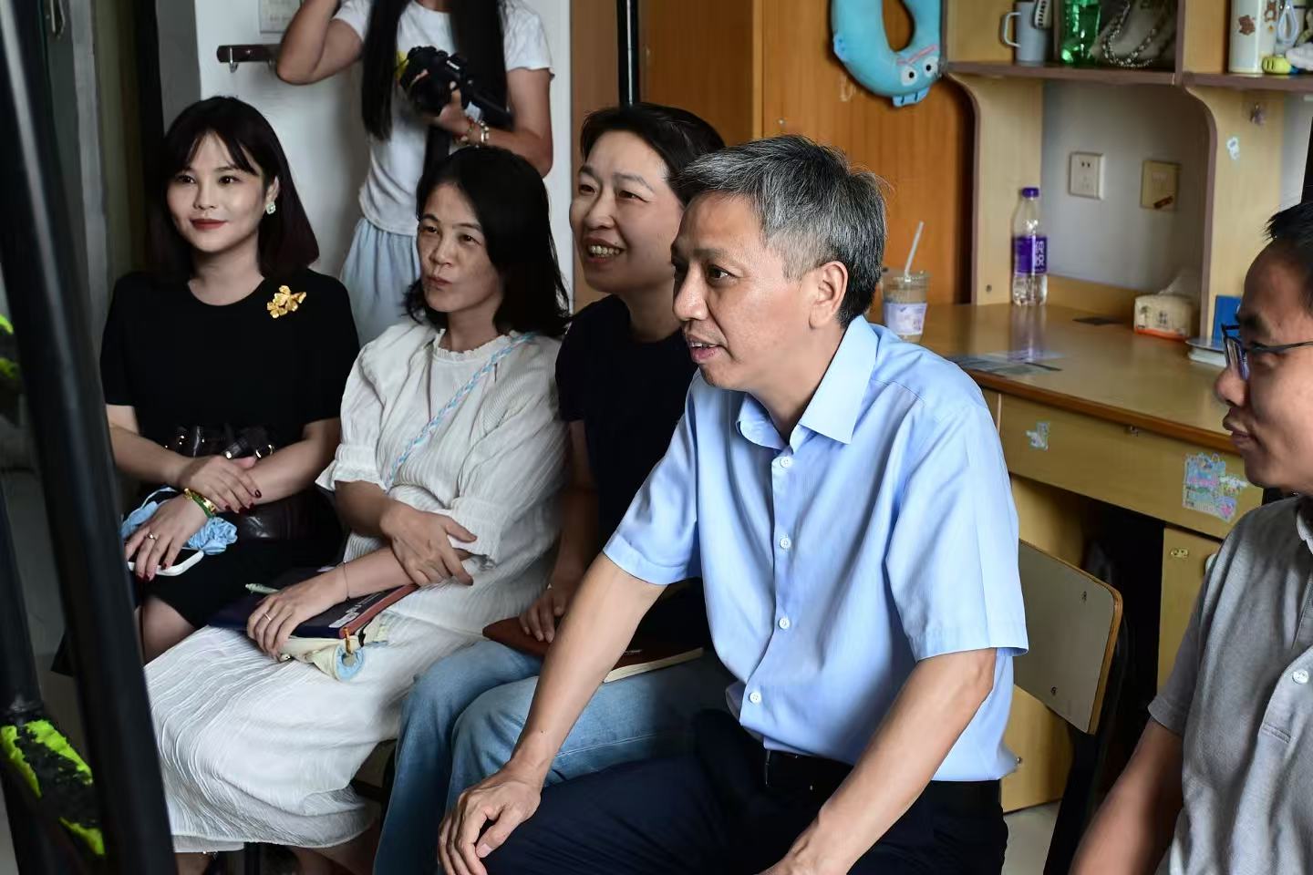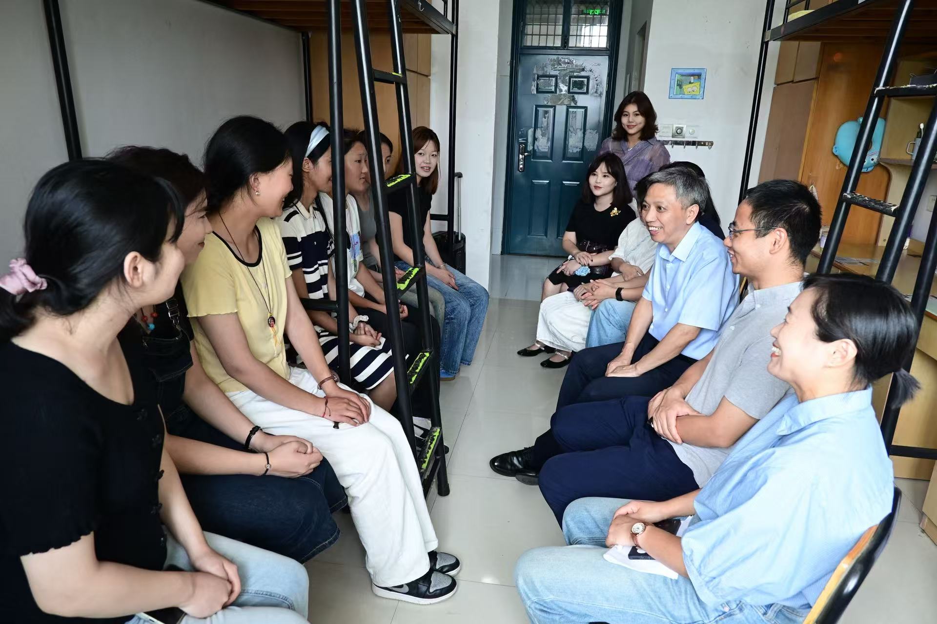 9月20日,为深入了解新生入校适应情况,校长梁克东走访师范学院"一站式“学生社区鹿田书院2025级新生寝室,向同学们传递学校关怀,实验室管理处处长单盈、学工部副部长金菲菲、学院领导班子、学工办(团委)负责人陪同走访。