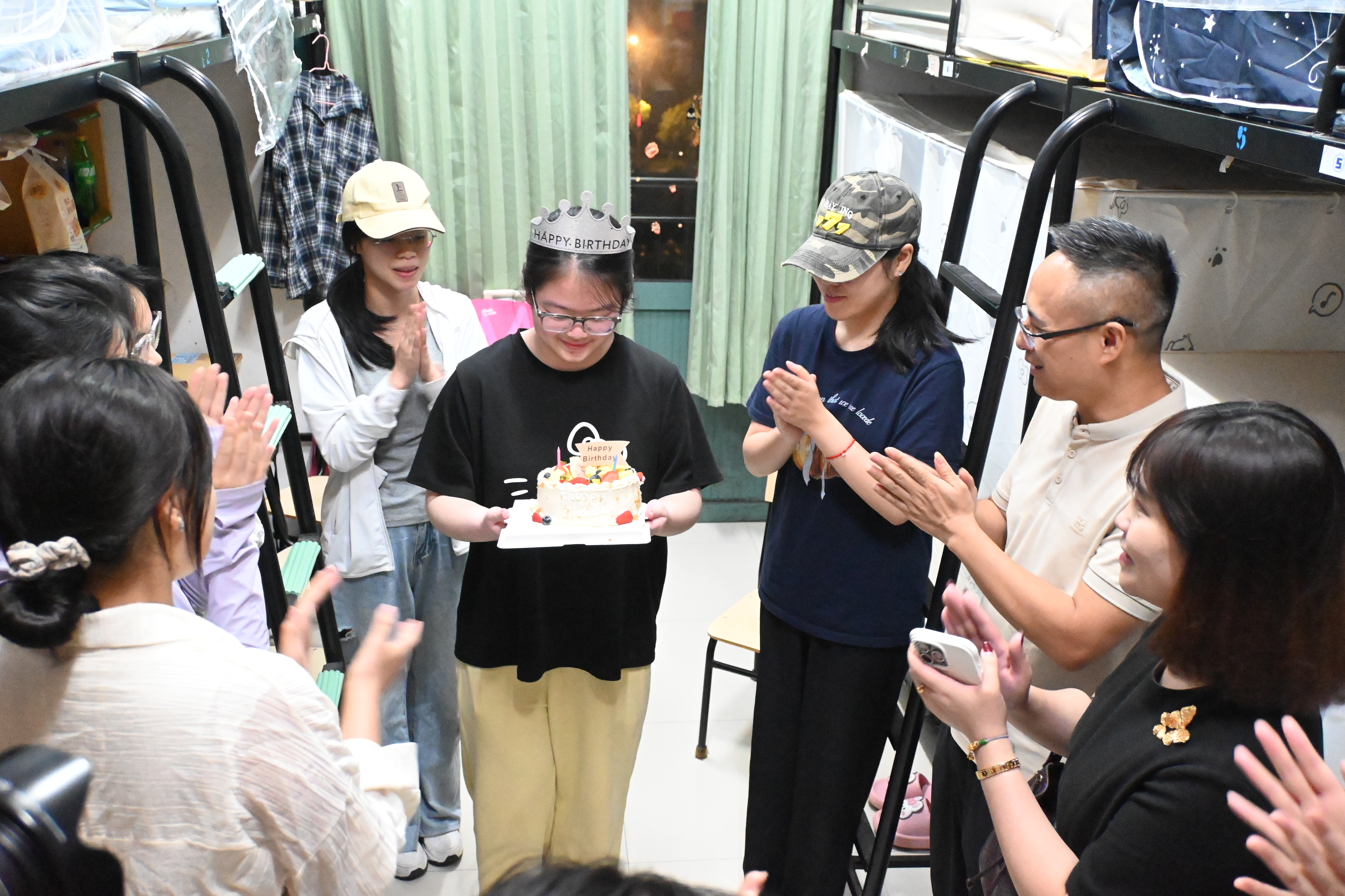 鹿田南苑03公寓422寝室的董安同学恰逢9月20日生日,师范学院副院长陈志为其准备了生日蛋糕,并在现场与同学们一起合唱生日歌,合影留念,现场气氛温馨融洽。