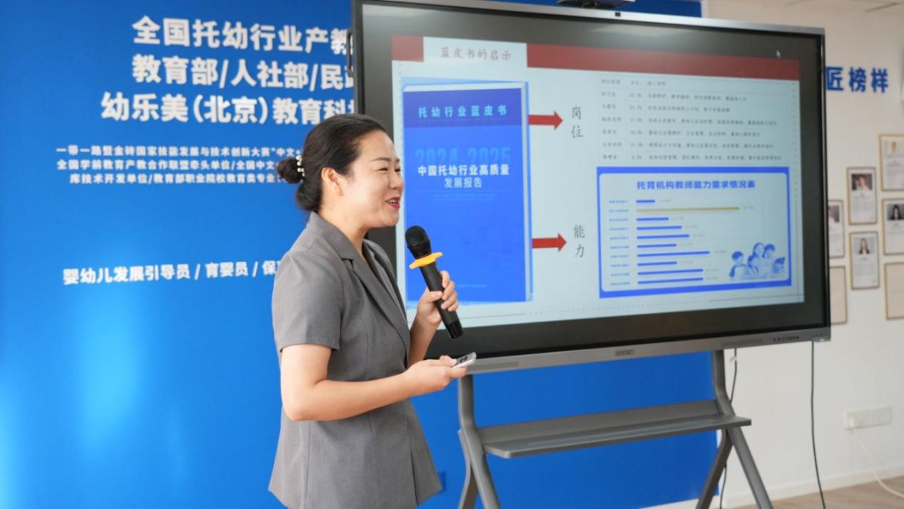 在报告环节,幼乐美产业学院李丹老师分享了《赋能教改、 融合共生,从蓝皮书到技能图谱、院校的教学改革实践》,王晶老师分享了《技能立标、科技赋能,从教学实践改革到“医园家校”的创新态度》等内容。