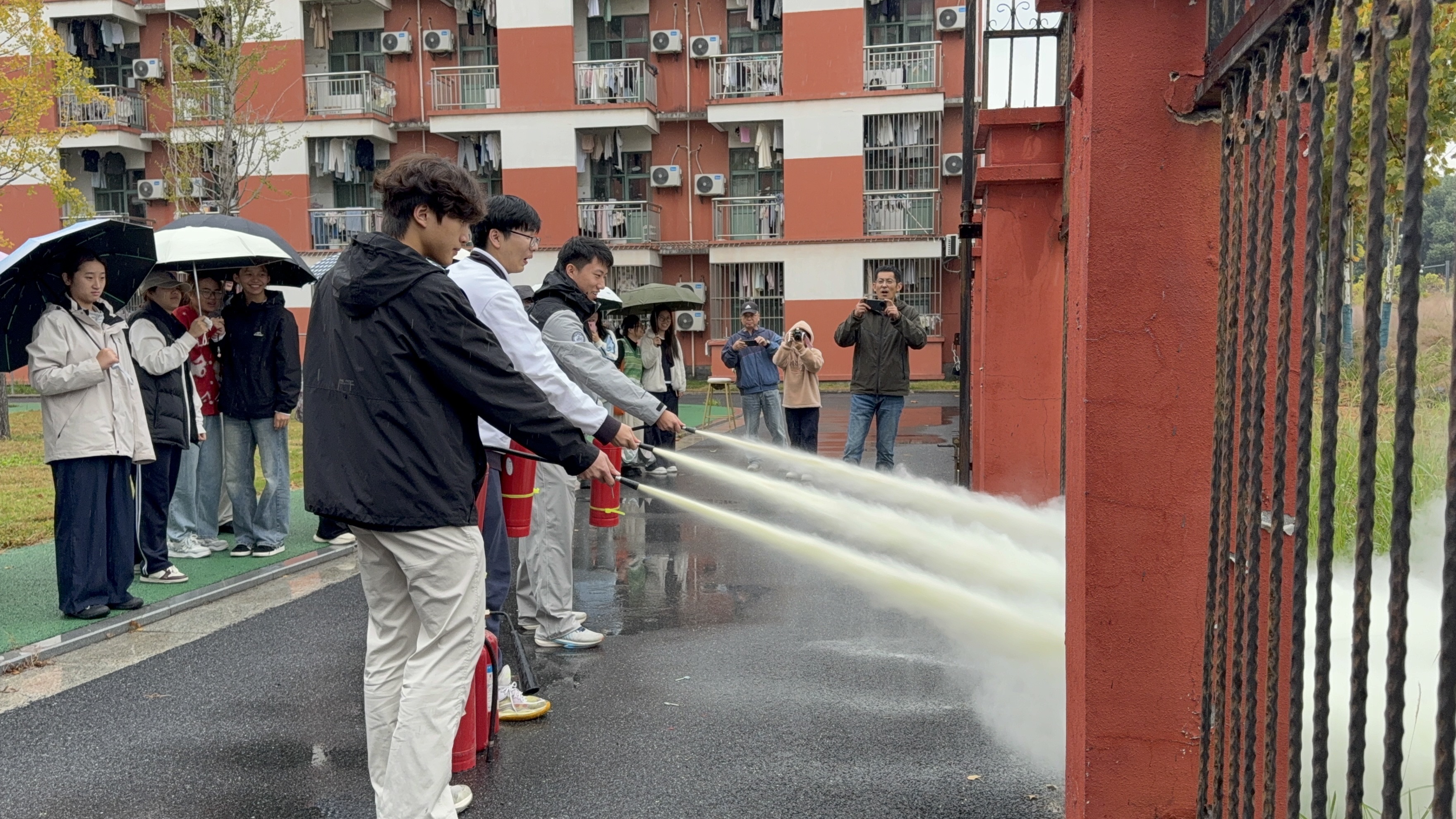 演习结束后,陆清东向在场师生详细讲解了二氧化碳灭火器和干粉灭火器的正确使用方法和使用场景,现场演示了灭火器“提、拔、握、压”的四个关键步骤。在专业指导下,多名学生代表和辅导员踊跃上前,亲身体验了灭火操作。