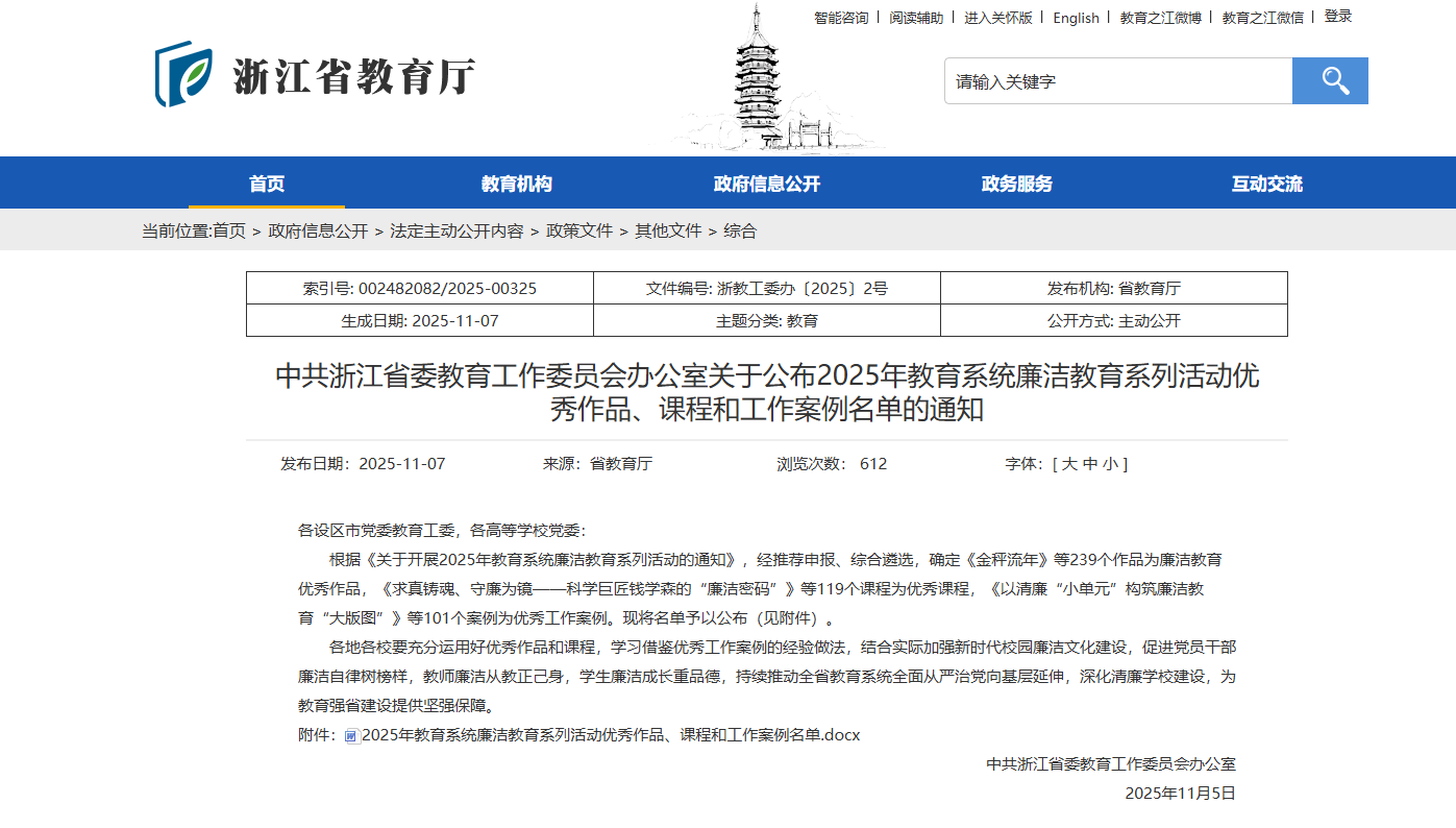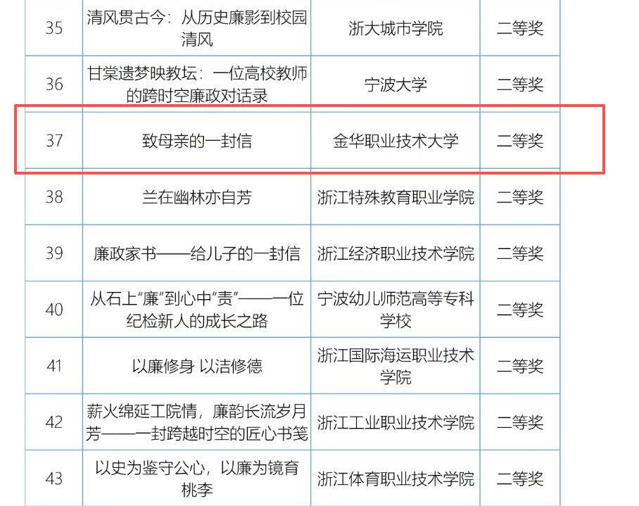 近日,浙江省2025年教育系统廉洁教育系列活动优秀作品、课程和工作案例名单公布,师范学院学生小学教育专业小教本242康虹奕创作的作品《致母亲的一封信》从全省众多参赛作品中脱颖而出,荣获优秀作品二等奖,充分展现了师范生坚守廉洁初心、涵养教育情怀的精神风貌。