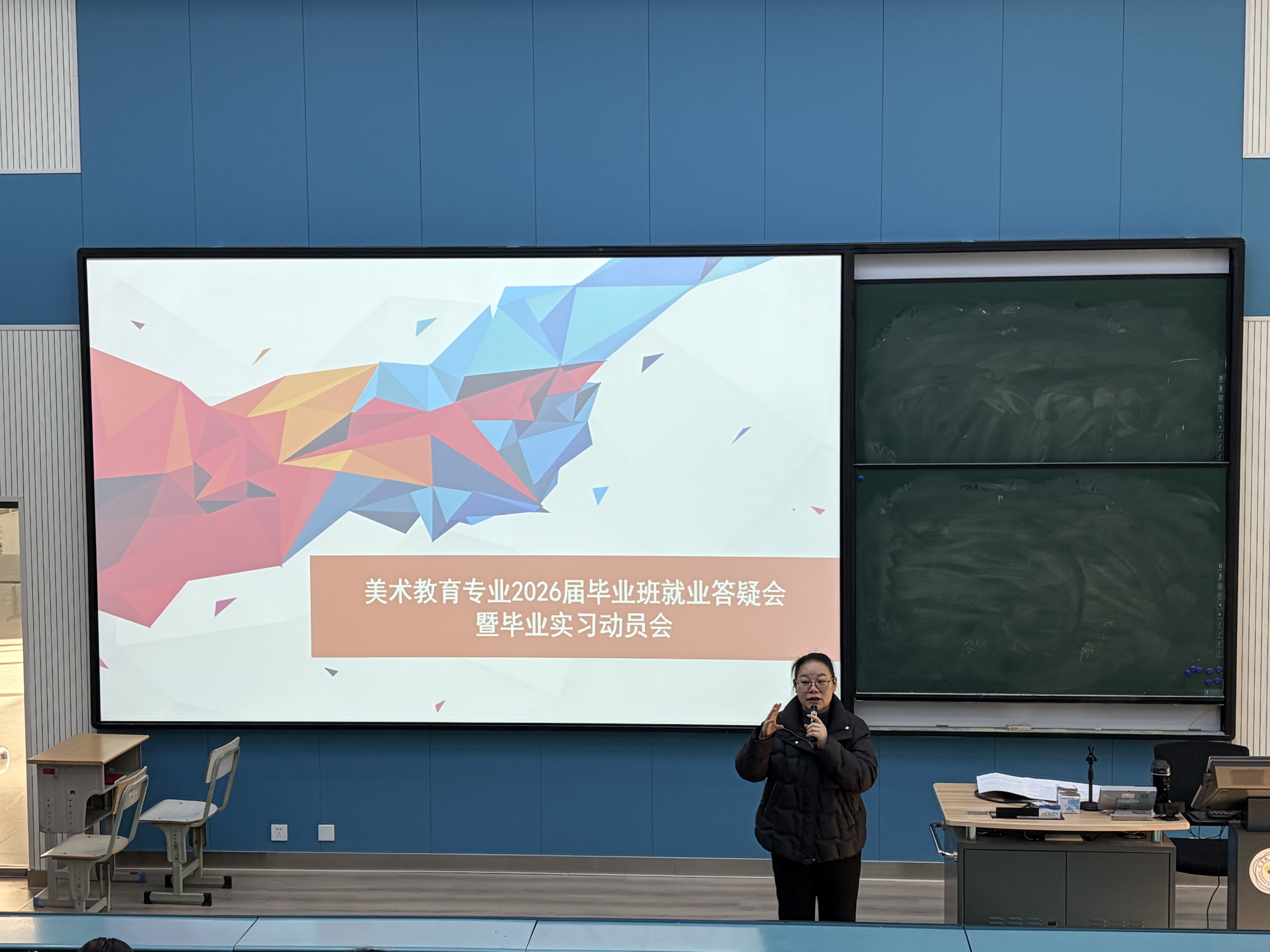 1月9日,为帮助毕业生进一步熟悉毕业实习与就业相关流程,美术教育专业召开2026届毕业实习动员会暨就业答疑会,美教专业全体教师与应届毕业生参会。